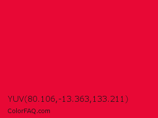YUV 80.106,-13.363,133.211 Color is a normal red color and the nearest color is Medium Candy Apple Red #e2062c. Hex code #e80835 and RGB value is rgb(232,8,53). In RGB color space, this color is composed of 91% red, 3% green, 21% blue, In CMYK color space, this color is composed of 0% cyan, 97% magenta, 77% yellow , 9% black , In HSL color space, this color has a hue angle of 348° , 93% saturation and 47% lightness.