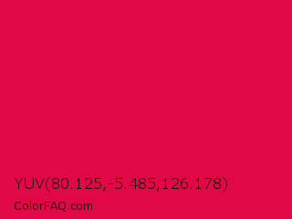 YUV 80.125,-5.485,126.178 Color is a normal rose color and the nearest color is UA Red #d9004c. Hex code #e00945 and RGB value is rgb(224,9,69). In RGB color space, this color is composed of 88% red, 4% green, 27% blue, In CMYK color space, this color is composed of 0% cyan, 96% magenta, 69% yellow , 12% black , In HSL color space, this color has a hue angle of 343° , 92% saturation and 46% lightness.