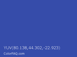 YUV 80.138,44.302,-22.923 Color is a normal blue color and the nearest color is Violet Blue #324ab2. Hex code #364caa and RGB value is rgb(54,76,170). In RGB color space, this color is composed of 21% red, 30% green, 67% blue, In CMYK color space, this color is composed of 68% cyan, 55% magenta, 0% yellow , 33% black , In HSL color space, this color has a hue angle of 229° , 52% saturation and 44% lightness.