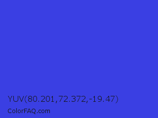 YUV 80.201,72.372,-19.47 Color is a normal blue color and the nearest color is Palatinate Blue #273be2. Hex code #3a3fe3 and RGB value is rgb(58,63,227). In RGB color space, this color is composed of 23% red, 25% green, 89% blue, In CMYK color space, this color is composed of 74% cyan, 72% magenta, 0% yellow , 11% black , In HSL color space, this color has a hue angle of 238° , 75% saturation and 56% lightness.