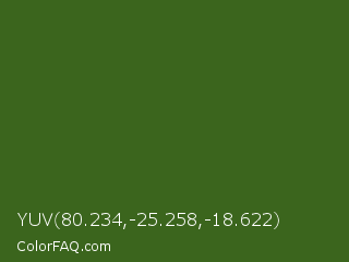 YUV 80.234,-25.258,-18.622 Color is a dark green color and the nearest color is Dell #396413. Hex code #3b651d and RGB value is rgb(59,101,29). In RGB color space, this color is composed of 23% red, 40% green, 11% blue, In CMYK color space, this color is composed of 42% cyan, 0% magenta, 71% yellow , 60% black , In HSL color space, this color has a hue angle of 95° , 55% saturation and 25% lightness.