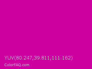 YUV 80.247,39.811,111.162 Color is a normal magenta color and the nearest color is Red Violet #c71585. Hex code #cf00a1 and RGB value is rgb(207,-0,161). In RGB color space, this color is composed of 81% red, 0% green, 63% blue, In CMYK color space, this color is composed of 0% cyan, 100% magenta, 22% yellow , 19% black , In HSL color space, this color has a hue angle of 313° , 100% saturation and 41% lightness.