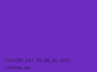 YUV 80.247,56.08,26.093 Color is a normal violet color and the nearest color is Purple Heart Crayola #652dc1. Hex code #6e2bc2 and RGB value is rgb(110,43,194). In RGB color space, this color is composed of 43% red, 17% green, 76% blue, In CMYK color space, this color is composed of 43% cyan, 78% magenta, 0% yellow , 24% black , In HSL color space, this color has a hue angle of 267° , 64% saturation and 46% lightness.