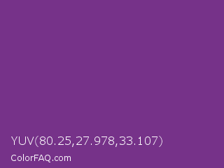 YUV 80.25,27.978,33.107 Color is a normal purple color and the nearest color is Maximum Purple #733380. Hex code #763289 and RGB value is rgb(118,50,137). In RGB color space, this color is composed of 46% red, 20% green, 54% blue, In CMYK color space, this color is composed of 14% cyan, 64% magenta, 0% yellow , 46% black , In HSL color space, this color has a hue angle of 287° , 47% saturation and 37% lightness.