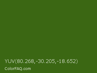 YUV 80.268,-30.205,-18.652 Color is a dark green color and the nearest color is Dell #396413. Hex code #3b6713 and RGB value is rgb(59,103,19). In RGB color space, this color is composed of 23% red, 40% green, 7% blue, In CMYK color space, this color is composed of 43% cyan, 0% magenta, 82% yellow , 60% black , In HSL color space, this color has a hue angle of 91° , 69% saturation and 24% lightness.