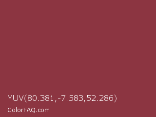 YUV 80.381,-7.583,52.286 Color is a normal red color and the nearest color is Solid Pink #893843. Hex code #8c3541 and RGB value is rgb(140,53,65). In RGB color space, this color is composed of 55% red, 21% green, 25% blue, In CMYK color space, this color is composed of 0% cyan, 62% magenta, 54% yellow , 45% black , In HSL color space, this color has a hue angle of 352° , 45% saturation and 38% lightness.