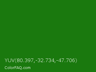 YUV 80.397,-32.734,-47.706 Color is a dark green color and the nearest color is India Green #138808. Hex code #1a790e and RGB value is rgb(26,121,14). In RGB color space, this color is composed of 10% red, 47% green, 5% blue, In CMYK color space, this color is composed of 79% cyan, 0% magenta, 88% yellow , 53% black , In HSL color space, this color has a hue angle of 113° , 79% saturation and 26% lightness.