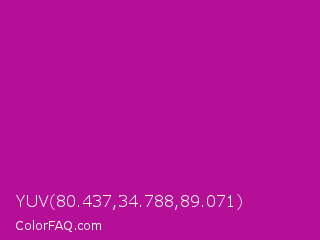 YUV 80.437,34.788,89.071 Color is a normal magenta color and the nearest color is Red Violet #c71585. Hex code #b60f97 and RGB value is rgb(182,15,151). In RGB color space, this color is composed of 71% red, 6% green, 59% blue, In CMYK color space, this color is composed of 0% cyan, 92% magenta, 17% yellow , 29% black , In HSL color space, this color has a hue angle of 311° , 85% saturation and 39% lightness.