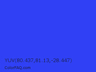 YUV 80.437,81.13,-28.447 Color is a normal blue color and the nearest color is Palatinate Blue #273be2. Hex code #3041f5 and RGB value is rgb(48,65,245). In RGB color space, this color is composed of 19% red, 25% green, 96% blue, In CMYK color space, this color is composed of 80% cyan, 73% magenta, 0% yellow , 4% black , In HSL color space, this color has a hue angle of 235° , 91% saturation and 57% lightness.