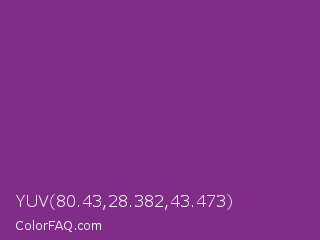 YUV 80.43,28.382,43.473 Color is a normal magenta color and the nearest color is Vivid Violet #803790. Hex code #822c8a and RGB value is rgb(130,44,138). In RGB color space, this color is composed of 51% red, 17% green, 54% blue, In CMYK color space, this color is composed of 6% cyan, 68% magenta, 0% yellow , 46% black , In HSL color space, this color has a hue angle of 295° , 52% saturation and 36% lightness.