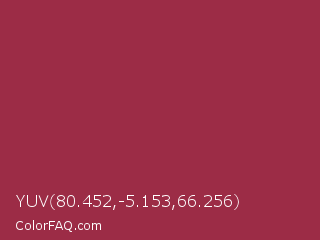 YUV 80.452,-5.153,66.256 Color is a normal red color and the nearest color is Big Dip O Ruby #9c2542. Hex code #9c2c46 and RGB value is rgb(156,44,70). In RGB color space, this color is composed of 61% red, 17% green, 27% blue, In CMYK color space, this color is composed of 0% cyan, 72% magenta, 55% yellow , 39% black , In HSL color space, this color has a hue angle of 346° , 56% saturation and 39% lightness.