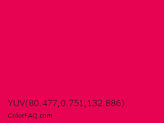 YUV 80.477,0.751,132.886 Color is a normal rose color and the nearest color is Razzmatazz Crayola #e30b5c. Hex code #e80352 and RGB value is rgb(232,3,82). In RGB color space, this color is composed of 91% red, 1% green, 32% blue, In CMYK color space, this color is composed of 0% cyan, 99% magenta, 65% yellow , 9% black , In HSL color space, this color has a hue angle of 339° , 97% saturation and 46% lightness.
