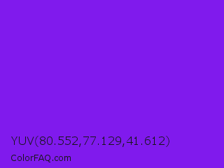 YUV 80.552,77.129,41.612 Color is a normal violet color and the nearest color is Blue Violet #8a2be2. Hex code #801aed and RGB value is rgb(128,26,237). In RGB color space, this color is composed of 50% red, 10% green, 93% blue, In CMYK color space, this color is composed of 46% cyan, 89% magenta, 0% yellow , 7% black , In HSL color space, this color has a hue angle of 269° , 85% saturation and 52% lightness.