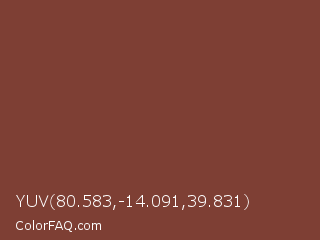 YUV 80.583,-14.091,39.831 Color is a normal red color and the nearest color is Nutmeg #81422c. Hex code #7e3f34 and RGB value is rgb(126,63,52). In RGB color space, this color is composed of 49% red, 25% green, 20% blue, In CMYK color space, this color is composed of 0% cyan, 50% magenta, 59% yellow , 51% black , In HSL color space, this color has a hue angle of 9° , 42% saturation and 35% lightness.
