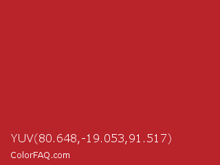 YUV 80.648,-19.053,91.517 Color is a normal red color and the nearest color is Firebrick #b22222. Hex code #b9232a and RGB value is rgb(185,35,42). In RGB color space, this color is composed of 73% red, 14% green, 16% blue, In CMYK color space, this color is composed of 0% cyan, 81% magenta, 77% yellow , 27% black , In HSL color space, this color has a hue angle of 357° , 68% saturation and 43% lightness.