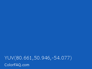 YUV 80.661,50.946,-54.077 Color is a normal blue color and the nearest color is Denim #1560bd. Hex code #135cb8 and RGB value is rgb(19,92,184). In RGB color space, this color is composed of 7% red, 36% green, 72% blue, In CMYK color space, this color is composed of 90% cyan, 50% magenta, 0% yellow , 28% black , In HSL color space, this color has a hue angle of 213° , 81% saturation and 40% lightness.