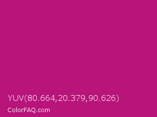 YUV 80.664,20.379,90.626 Color is a normal magenta color and the nearest color is Red Violet #c71585. Hex code #b8147a and RGB value is rgb(184,20,122). In RGB color space, this color is composed of 72% red, 8% green, 48% blue, In CMYK color space, this color is composed of 0% cyan, 89% magenta, 34% yellow , 28% black , In HSL color space, this color has a hue angle of 323° , 80% saturation and 40% lightness.
