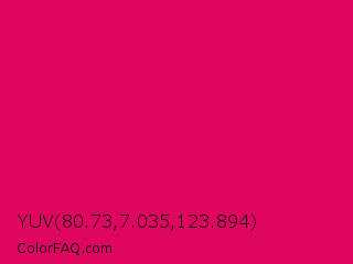 YUV 80.73,7.035,123.894 Color is a normal rose color and the nearest color is Raspberry #e30b5d. Hex code #de065f and RGB value is rgb(222,6,95). In RGB color space, this color is composed of 87% red, 2% green, 37% blue, In CMYK color space, this color is composed of 0% cyan, 97% magenta, 57% yellow , 13% black , In HSL color space, this color has a hue angle of 335° , 95% saturation and 45% lightness.