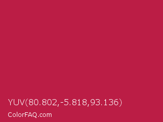 YUV 80.802,-5.818,93.136 Color is a normal red color and the nearest color is Maroon Flush #c32148. Hex code #bb1d45 and RGB value is rgb(187,29,69). In RGB color space, this color is composed of 73% red, 11% green, 27% blue, In CMYK color space, this color is composed of 0% cyan, 84% magenta, 63% yellow , 27% black , In HSL color space, this color has a hue angle of 345° , 73% saturation and 42% lightness.
