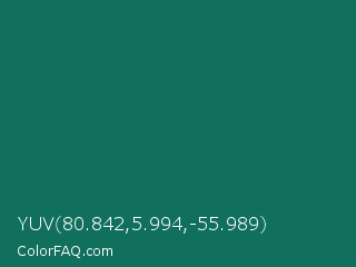 YUV 80.842,5.994,-55.989 Color is a dark cyan color and the nearest color is Watercourse #056f57. Hex code #116f5d and RGB value is rgb(17,111,93). In RGB color space, this color is composed of 7% red, 44% green, 36% blue, In CMYK color space, this color is composed of 85% cyan, 0% magenta, 16% yellow , 56% black , In HSL color space, this color has a hue angle of 169° , 73% saturation and 25% lightness.