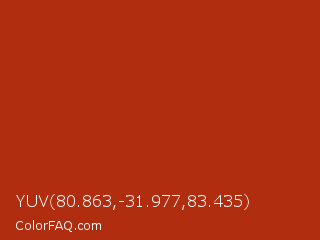 YUV 80.863,-31.977,83.435 Color is a normal red color and the nearest color is Tabasco #a02712. Hex code #b02d10 and RGB value is rgb(176,45,16). In RGB color space, this color is composed of 69% red, 18% green, 6% blue, In CMYK color space, this color is composed of 0% cyan, 74% magenta, 91% yellow , 31% black , In HSL color space, this color has a hue angle of 11° , 83% saturation and 38% lightness.