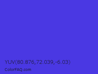YUV 80.876,72.039,-6.03 Color is a normal indigo color and the nearest color is Majorelle Blue #6050dc. Hex code #4a38e3 and RGB value is rgb(74,56,227). In RGB color space, this color is composed of 29% red, 22% green, 89% blue, In CMYK color space, this color is composed of 67% cyan, 75% magenta, 0% yellow , 11% black , In HSL color space, this color has a hue angle of 246° , 75% saturation and 55% lightness.