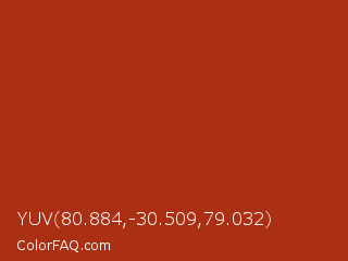 YUV 80.884,-30.509,79.032 Color is a normal red color and the nearest color is Tabasco #a02712. Hex code #ab2f13 and RGB value is rgb(171,47,19). In RGB color space, this color is composed of 67% red, 18% green, 7% blue, In CMYK color space, this color is composed of 0% cyan, 73% magenta, 89% yellow , 33% black , In HSL color space, this color has a hue angle of 11° , 80% saturation and 37% lightness.