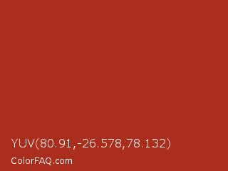 YUV 80.91,-26.578,78.132 Color is a normal red color and the nearest color is Roof Terracotta #a62f20. Hex code #aa2e1b and RGB value is rgb(170,46,27). In RGB color space, this color is composed of 67% red, 18% green, 11% blue, In CMYK color space, this color is composed of 0% cyan, 73% magenta, 84% yellow , 33% black , In HSL color space, this color has a hue angle of 8° , 73% saturation and 39% lightness.