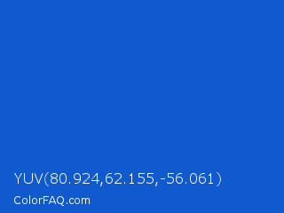 YUV 80.924,62.155,-56.061 Color is a normal blue color and the nearest color is Denim #1560bd. Hex code #1159cf and RGB value is rgb(17,89,207). In RGB color space, this color is composed of 7% red, 35% green, 81% blue, In CMYK color space, this color is composed of 92% cyan, 57% magenta, 0% yellow , 19% black , In HSL color space, this color has a hue angle of 217° , 85% saturation and 44% lightness.