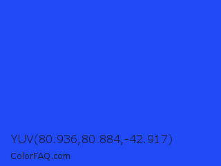 YUV 80.936,80.884,-42.917 Color is a normal blue color and the nearest color is Palatinate Blue #273be2. Hex code #204af5 and RGB value is rgb(32,74,245). In RGB color space, this color is composed of 13% red, 29% green, 96% blue, In CMYK color space, this color is composed of 87% cyan, 70% magenta, 0% yellow , 4% black , In HSL color space, this color has a hue angle of 228° , 91% saturation and 54% lightness.