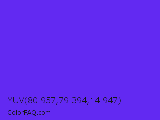 YUV 80.957,79.394,14.947 Color is a normal indigo color and the nearest color is Han Purple #5218fa. Hex code #6229f2 and RGB value is rgb(98,41,242). In RGB color space, this color is composed of 38% red, 16% green, 95% blue, In CMYK color space, this color is composed of 60% cyan, 83% magenta, 0% yellow , 5% black , In HSL color space, this color has a hue angle of 257° , 89% saturation and 55% lightness.