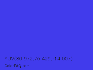 YUV 80.972,76.429,-14.007 Color is a normal indigo color and the nearest color is Palatinate Blue #273be2. Hex code #413bec and RGB value is rgb(65,59,236). In RGB color space, this color is composed of 25% red, 23% green, 93% blue, In CMYK color space, this color is composed of 72% cyan, 75% magenta, 0% yellow , 7% black , In HSL color space, this color has a hue angle of 242° , 82% saturation and 58% lightness.