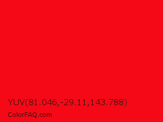 YUV 81.046,-29.11,143.788 Color is a normal red color and the nearest color is Vivid Red #f70d1a. Hex code #f50916 and RGB value is rgb(245,9,22). In RGB color space, this color is composed of 96% red, 4% green, 9% blue, In CMYK color space, this color is composed of 0% cyan, 96% magenta, 91% yellow , 4% black , In HSL color space, this color has a hue angle of 357° , 93% saturation and 50% lightness.