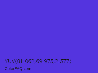 YUV 81.062,69.975,2.577 Color is a normal indigo color and the nearest color is Majorelle Blue #6050dc. Hex code #5434df and RGB value is rgb(84,52,223). In RGB color space, this color is composed of 33% red, 20% green, 87% blue, In CMYK color space, this color is composed of 62% cyan, 77% magenta, 0% yellow , 13% black , In HSL color space, this color has a hue angle of 251° , 73% saturation and 54% lightness.