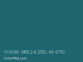 YUV 81.085,14.255,-45.679 Color is a dark cyan color and the nearest color is Genoa #15736b. Hex code #1d666e and RGB value is rgb(29,102,110). In RGB color space, this color is composed of 11% red, 40% green, 43% blue, In CMYK color space, this color is composed of 74% cyan, 7% magenta, 0% yellow , 57% black , In HSL color space, this color has a hue angle of 186° , 58% saturation and 27% lightness.