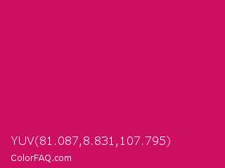 YUV 81.087,8.831,107.795 Color is a normal rose color and the nearest color is Dogwood Rose #d71868. Hex code #cc0f63 and RGB value is rgb(204,15,99). In RGB color space, this color is composed of 80% red, 6% green, 39% blue, In CMYK color space, this color is composed of 0% cyan, 93% magenta, 51% yellow , 20% black , In HSL color space, this color has a hue angle of 333° , 86% saturation and 43% lightness.