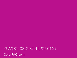 YUV 81.08,29.541,92.015 Color is a normal magenta color and the nearest color is Red Violet #c71585. Hex code #ba108d and RGB value is rgb(186,16,141). In RGB color space, this color is composed of 73% red, 6% green, 55% blue, In CMYK color space, this color is composed of 0% cyan, 91% magenta, 24% yellow , 27% black , In HSL color space, this color has a hue angle of 316° , 84% saturation and 40% lightness.