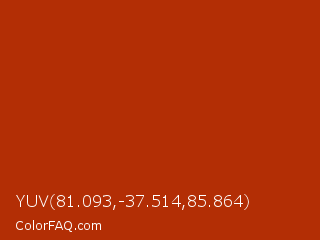 YUV 81.093,-37.514,85.864 Color is a normal red color and the nearest color is Rufous #a81c07. Hex code #b32e05 and RGB value is rgb(179,46,5). In RGB color space, this color is composed of 70% red, 18% green, 2% blue, In CMYK color space, this color is composed of 0% cyan, 74% magenta, 97% yellow , 30% black , In HSL color space, this color has a hue angle of 14° , 95% saturation and 36% lightness.