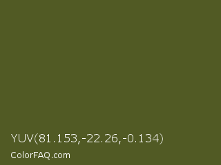 YUV 81.153,-22.26,-0.134 Color is a dark yellow color and the nearest color is Dark Moss Green #4a5d23. Hex code #515a24 and RGB value is rgb(81,90,36). In RGB color space, this color is composed of 32% red, 35% green, 14% blue, In CMYK color space, this color is composed of 10% cyan, 0% magenta, 60% yellow , 65% black , In HSL color space, this color has a hue angle of 70° , 43% saturation and 25% lightness.
