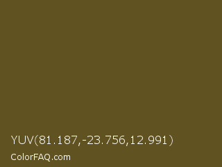 YUV 81.187,-23.756,12.991 Color is a dark yellow color and the nearest color is West Coast #625119. Hex code #605321 and RGB value is rgb(96,83,33). In RGB color space, this color is composed of 38% red, 33% green, 13% blue, In CMYK color space, this color is composed of 0% cyan, 14% magenta, 66% yellow , 62% black , In HSL color space, this color has a hue angle of 48° , 49% saturation and 25% lightness.