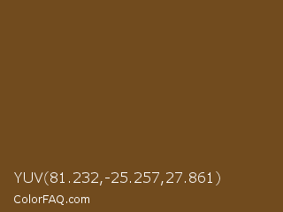 YUV 81.232,-25.257,27.861 Color is a dark orange color and the nearest color is Dallas #6e4b26. Hex code #714b1e and RGB value is rgb(113,75,30). In RGB color space, this color is composed of 44% red, 29% green, 12% blue, In CMYK color space, this color is composed of 0% cyan, 34% magenta, 73% yellow , 56% black , In HSL color space, this color has a hue angle of 33° , 58% saturation and 28% lightness.