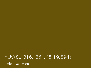 YUV 81.316,-36.145,19.894 Color is a very dark yellow color and the nearest color is Antique Bronze #704a07. Hex code #685408 and RGB value is rgb(104,84,8). In RGB color space, this color is composed of 41% red, 33% green, 3% blue, In CMYK color space, this color is composed of 0% cyan, 19% magenta, 92% yellow , 59% black , In HSL color space, this color has a hue angle of 48° , 86% saturation and 22% lightness.
