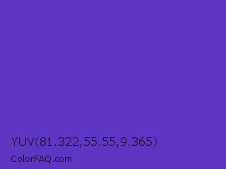 YUV 81.322,55.55,9.365 Color is a normal indigo color and the nearest color is Purple Heart Crayola #652dc1. Hex code #5c36c2 and RGB value is rgb(92,54,194). In RGB color space, this color is composed of 36% red, 21% green, 76% blue, In CMYK color space, this color is composed of 53% cyan, 72% magenta, 0% yellow , 24% black , In HSL color space, this color has a hue angle of 256° , 56% saturation and 49% lightness.
