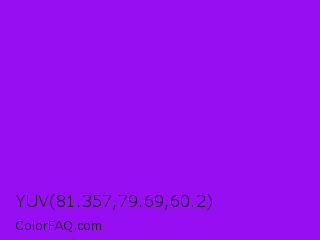 YUV 81.357,79.69,60.2 Color is a normal purple color and the nearest color is Veronica #a020f0. Hex code #960ff3 and RGB value is rgb(150,15,243). In RGB color space, this color is composed of 59% red, 6% green, 95% blue, In CMYK color space, this color is composed of 38% cyan, 94% magenta, 0% yellow , 5% black , In HSL color space, this color has a hue angle of 276° , 90% saturation and 51% lightness.
