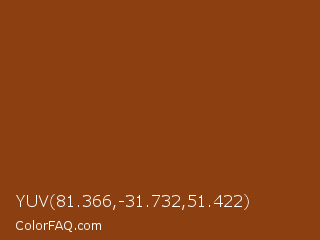 YUV 81.366,-31.732,51.422 Color is a normal orange color and the nearest color is Saddle Brown #8b4513. Hex code #8c4011 and RGB value is rgb(140,64,17). In RGB color space, this color is composed of 55% red, 25% green, 7% blue, In CMYK color space, this color is composed of 0% cyan, 54% magenta, 88% yellow , 45% black , In HSL color space, this color has a hue angle of 23° , 78% saturation and 31% lightness.