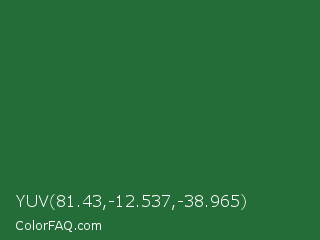 YUV 81.43,-12.537,-38.965 Color is a dark green color and the nearest color is Green Pea #1d6142. Hex code #256d38 and RGB value is rgb(37,109,56). In RGB color space, this color is composed of 15% red, 43% green, 22% blue, In CMYK color space, this color is composed of 66% cyan, 0% magenta, 49% yellow , 57% black , In HSL color space, this color has a hue angle of 136° , 49% saturation and 29% lightness.