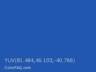 YUV 81.484,46.103,-40.766 Color is a normal blue color and the nearest color is Fun Blue #1959a8. Hex code #2357af and RGB value is rgb(35,87,175). In RGB color space, this color is composed of 14% red, 34% green, 69% blue, In CMYK color space, this color is composed of 80% cyan, 50% magenta, 0% yellow , 31% black , In HSL color space, this color has a hue angle of 218° , 67% saturation and 41% lightness.