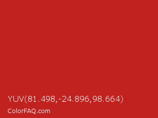 YUV 81.498,-24.896,98.664 Color is a normal red color and the nearest color is Thunderbird #c02b18. Hex code #c2221f and RGB value is rgb(194,34,31). In RGB color space, this color is composed of 76% red, 13% green, 12% blue, In CMYK color space, this color is composed of 0% cyan, 82% magenta, 84% yellow , 24% black , In HSL color space, this color has a hue angle of 1° , 72% saturation and 44% lightness.