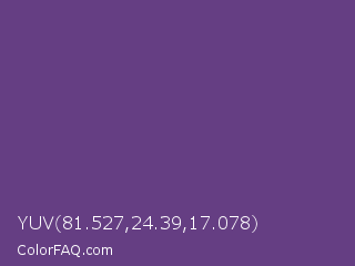 YUV 81.527,24.39,17.078 Color is a normal purple color and the nearest color is Cyber Grape #58427c. Hex code #653e83 and RGB value is rgb(101,62,131). In RGB color space, this color is composed of 40% red, 24% green, 51% blue, In CMYK color space, this color is composed of 23% cyan, 53% magenta, 0% yellow , 49% black , In HSL color space, this color has a hue angle of 274° , 36% saturation and 38% lightness.
