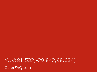 YUV 81.532,-29.842,98.634 Color is a normal red color and the nearest color is Thunderbird #c02b18. Hex code #c22415 and RGB value is rgb(194,36,21). In RGB color space, this color is composed of 76% red, 14% green, 8% blue, In CMYK color space, this color is composed of 0% cyan, 81% magenta, 89% yellow , 24% black , In HSL color space, this color has a hue angle of 5° , 80% saturation and 42% lightness.